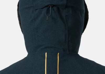 La capuche ajustable par cordons élastique est équipée d'un col montant, afin d'avoir une protection maximal de la tête et du cou, sa taille est suffisante pour garder votre casque de ski en dessous. La jupe pare neige intérieure vous protègera de la neige et du vent, vous pouvez également ajuster le bas de la veste avec un élastique.